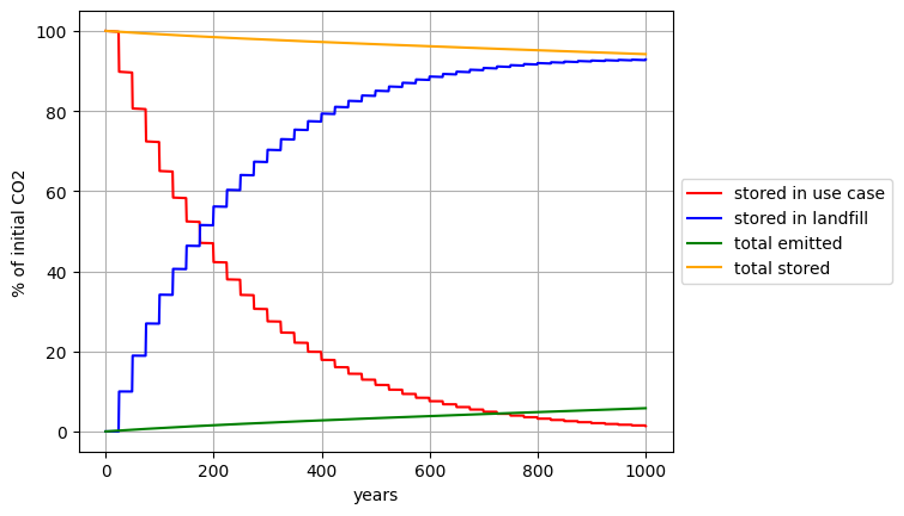 - Setting the closed-loop recycling likelihood to 0, and making the reversal_usecase and reversal_landfill parameters equal (e.g. both are 0.005%), then the reversal risk after 1,000 years is should be 5%