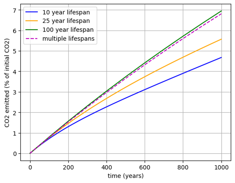 The effect of lifespan is highly dependent on the other parameters in Table A1.1. For example, if closed-loop recycling is set to a value greater than 0, then a short lifespan would result in a greater reversal than a long lifespan. This is because short lifespans will have more closed-loop recycling events which release CO2 to the atmosphere.