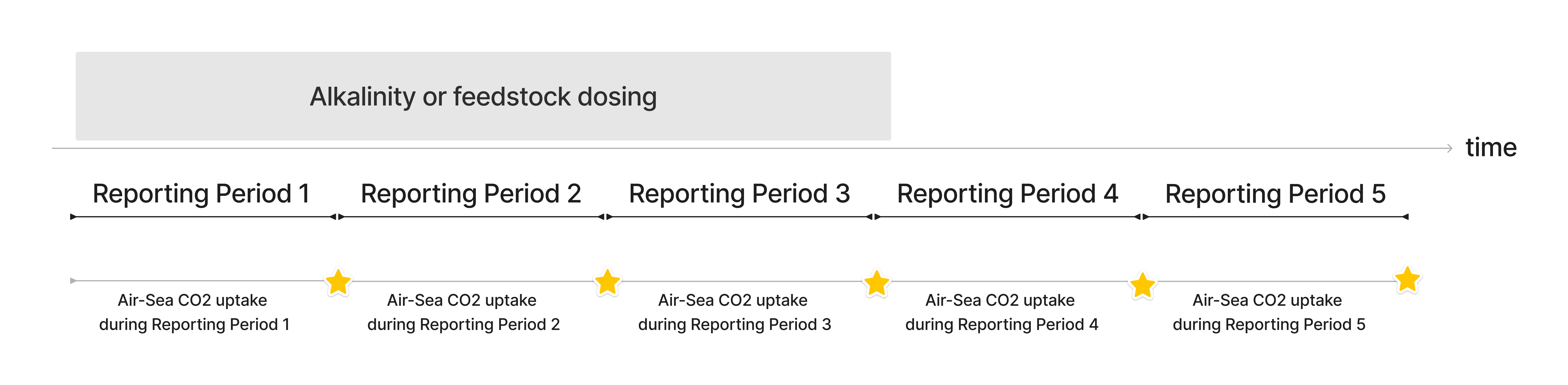 Figure A4-1 shows an example of Reporting Periods for an OAE project. In this example, the project is continuously dosing over a long period of time (gray rectangle). The net CO₂ uptake from air-sea gas exchange can be calculated using a paired simulation, and the full air-sea equilibration timescale extends beyond the end of the dosing period. The Project Proponent can divide up the air-sea CO₂ uptake timeline into multiple Reporting Periods, and the net CO₂ removal that occurs during a Reporting Period is calculated and verified, and Credits are issued at the end of each Reporting Period (denoted by the stars). The GHG Statment must appropriately allocate emissions between the Reporting Periods in compliance with Section 7.4.4 and in agreement with Isometric.