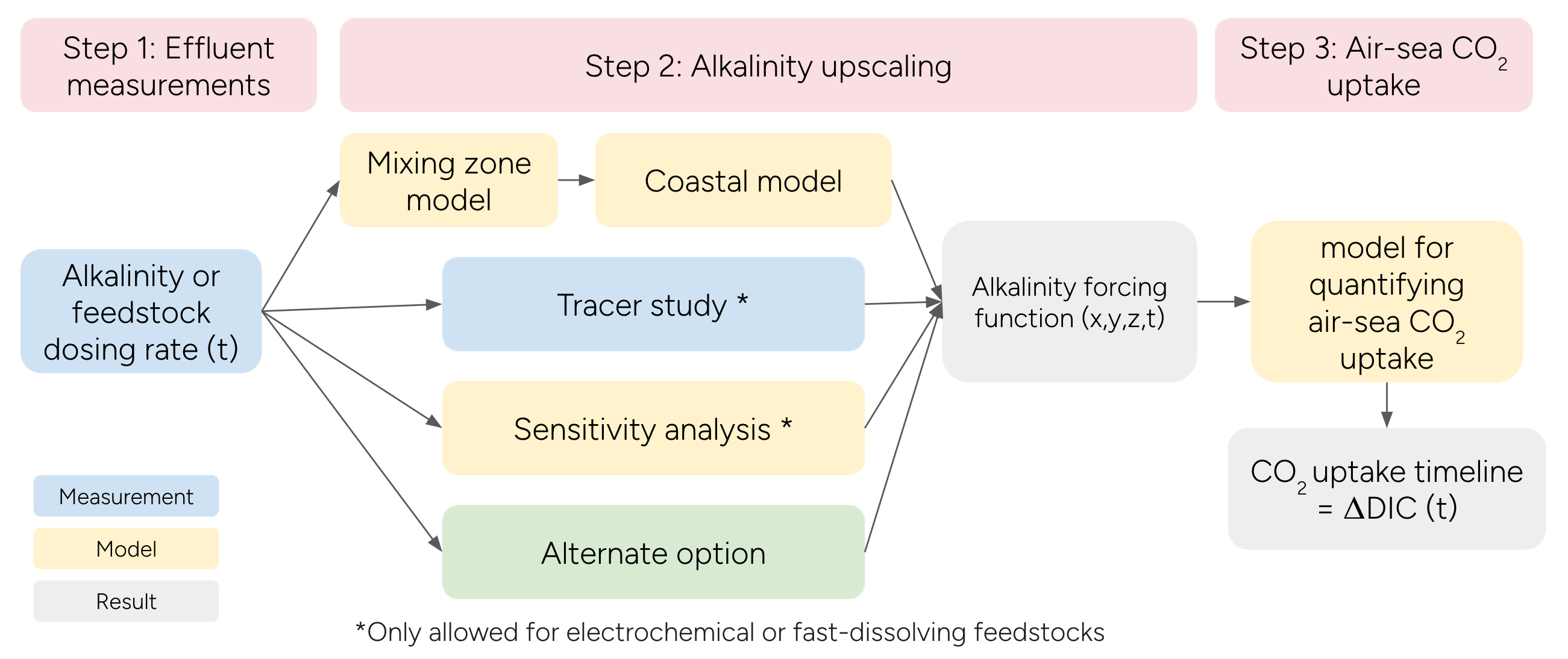 Figure A4-2 illustrates some of the quantification options described in Section 7.4.1. All projects must measure the alkalinity or feedstock dosing rate at the effluent (Step 1), and all projects must quantify the net CO₂ removal as a result of air-sea gas exchange in an appropriate ocean model (Step 3). To upscale the point source effluent measurements into a 3-dimensional alkalinity forcing that can be applied to the model used to quantify air-sea CO₂ uptake, Project Proponents have flexibility to choose from a number of options (Step 2).
