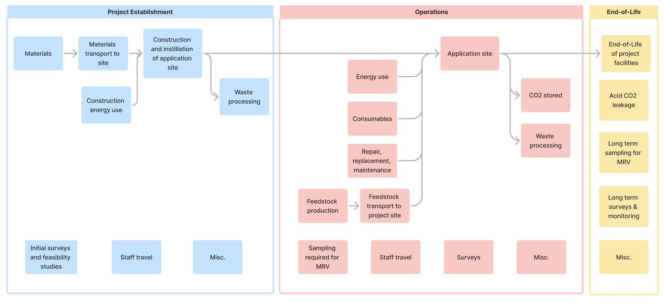 OAE projects can be categorized by the source of CO₂-reactive alkalinity (e.g. electrochemistry, mining or grinding), which is relevant to project System Boundary (See Section 7.2), and by the phase of alkalinity used (e.g. solid, liquid, slurry), which is relevant for quantifying dissolution in the ocean (Section 7.4.1.2). This Protocol applies to projects or processes which enhance Total Alkalinity in the surface ocean by one of the following processes.
